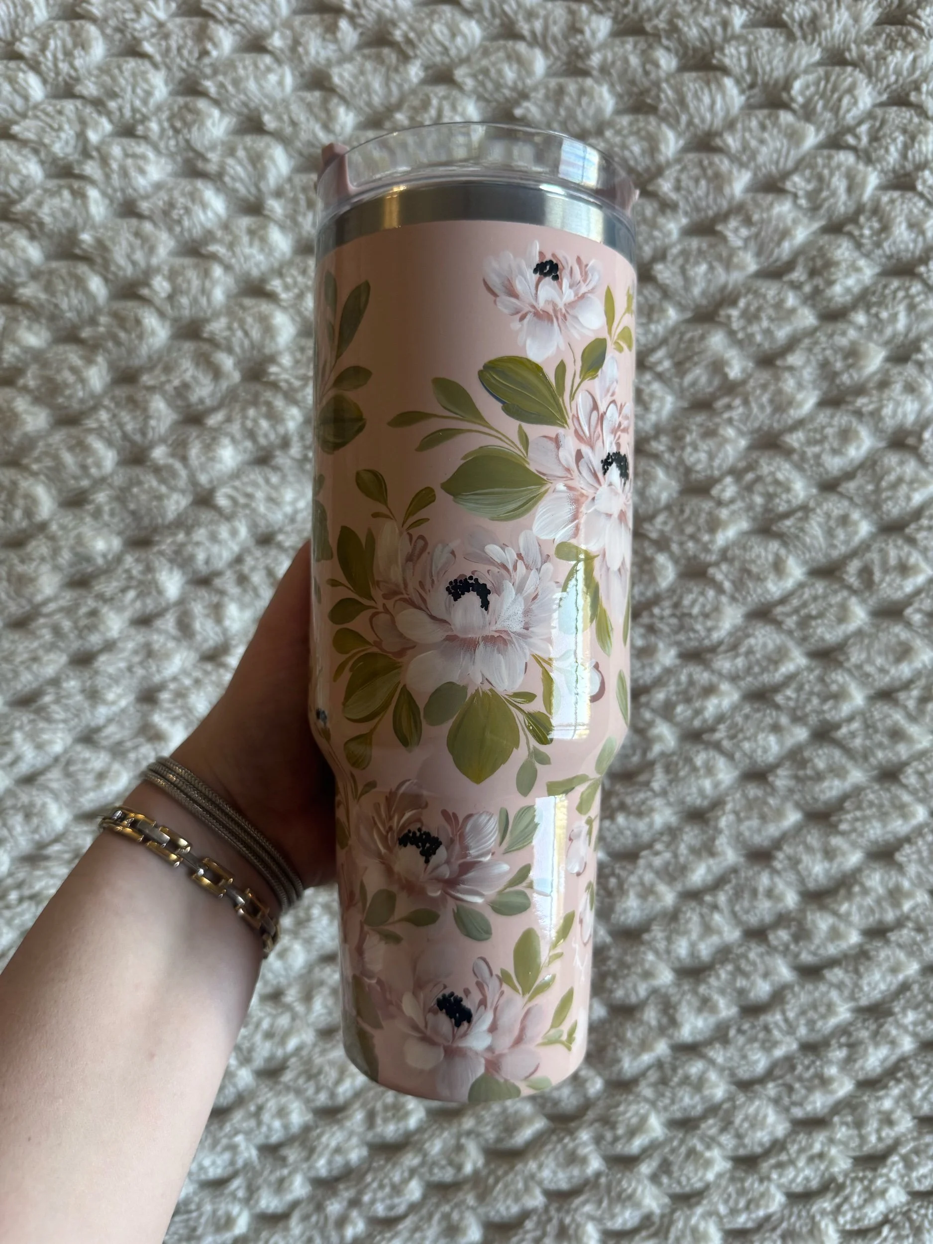 Hand painted with love & attention to detail, no two cups will ever be exactly alike. After spending time painting, this tumbler was powder coated individually to seal the art. Powder coating is a high heat chemical process which creates a strong barrier to keep the art safe. This tumbler is chip and scratch resistant.